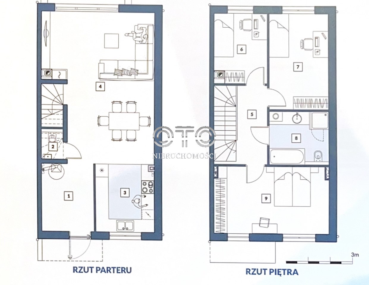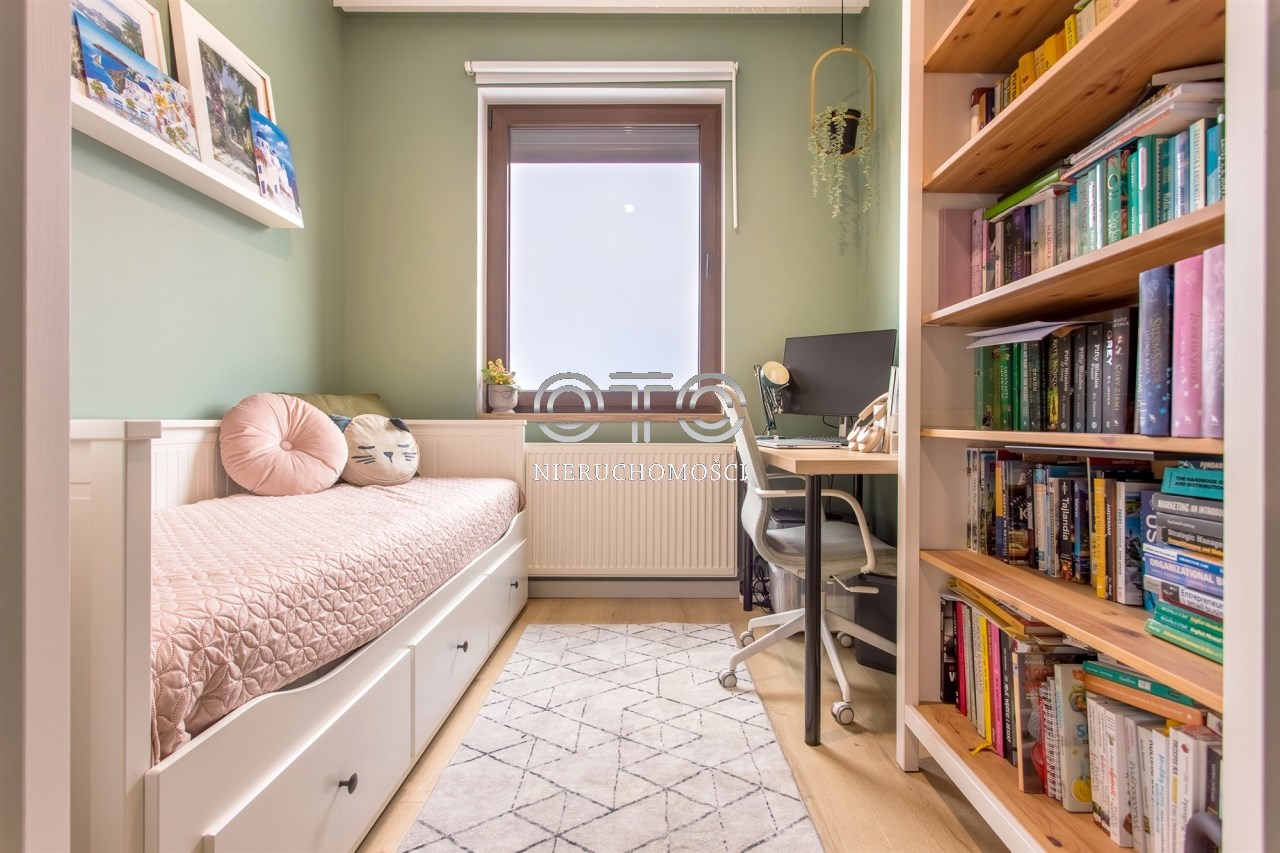 Na piętrze trzy ustawne sypialnie, duża łazienka z wanną i prysznicem.