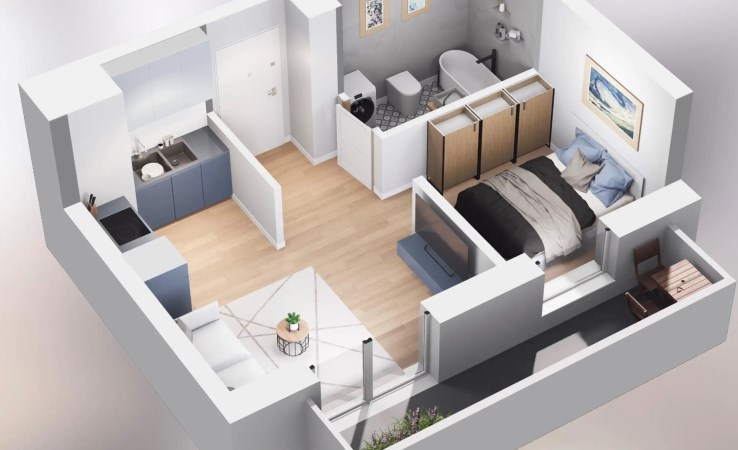 Rozkład mieszkania umożliwia zrobienie 2 pokoi.