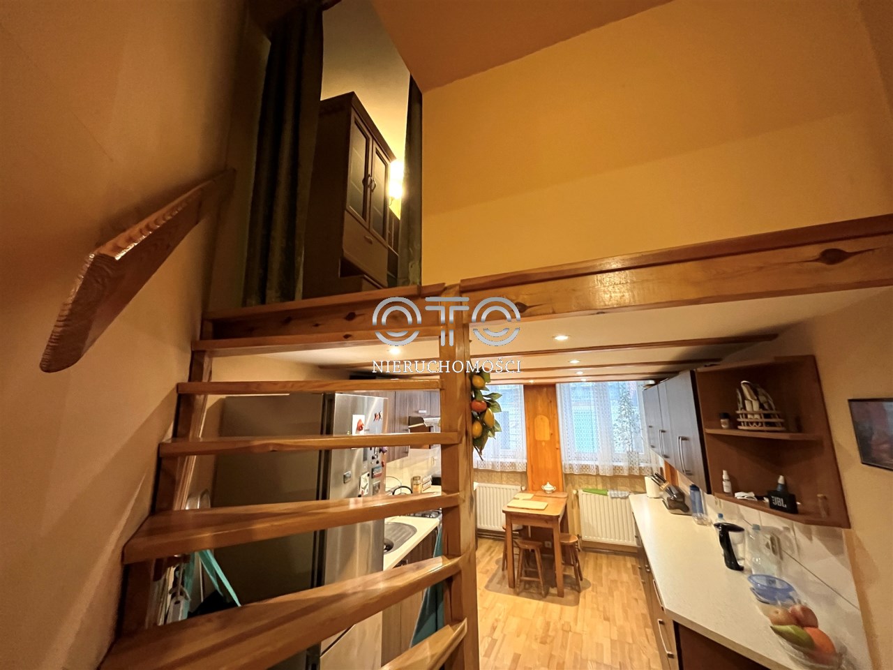 Dzięki wysokości mieszkania udało się zagospodarować dodatkową przestrzeń. Nad kuchnią antresola pełniąca funkcję sypialni, a nad przedpokojem przestrzeń gospodarczą z miejscem do przechowywania oraz piecem gazowym.