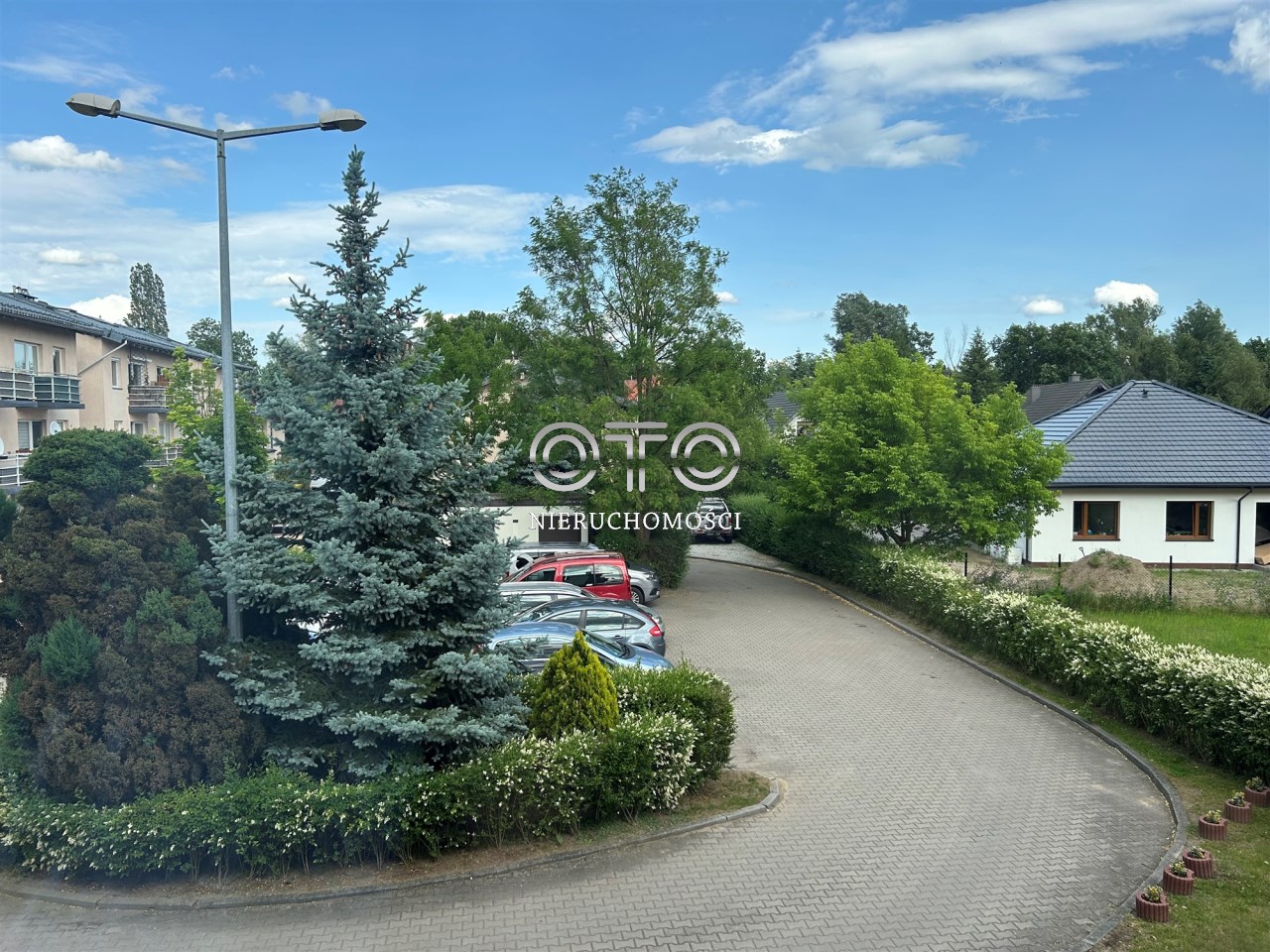 Teren ogrodzony z prywatnym parkingiem dla mieszkańców.
