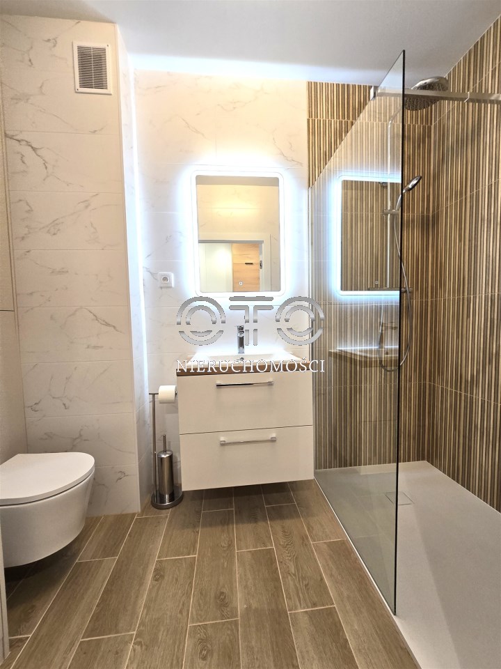 Nowoczesna łazienka została wyposażona w pojemne szafki oraz kabinę prysznicową.