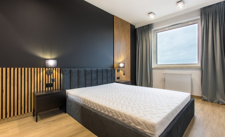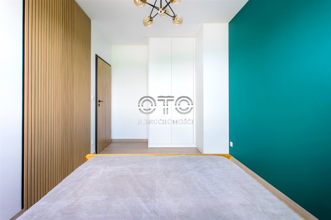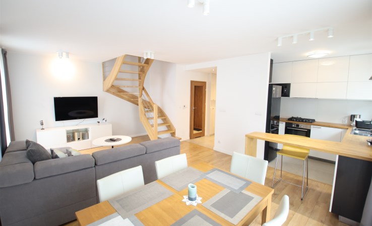 W salonie rozkładana sofa, wygodny stół oraz duża szafa na wymiar. Kuchnia jest komfortowo zaprojektowana na wymiar z pełnym AGD (zmywarka, piekarnik, płyta indukcyjna, duża lodówka). W sypialni duże łóżko z materacem oraz duża szafa.