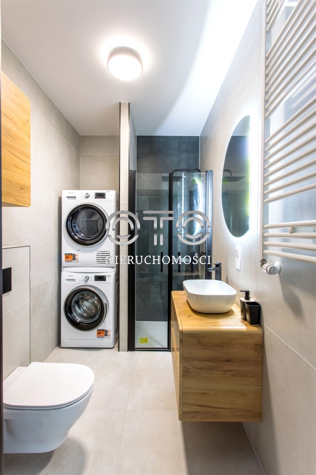 W łazience wygodna kabina z prysznicem, oddzielnie pralka oraz suszarka.
