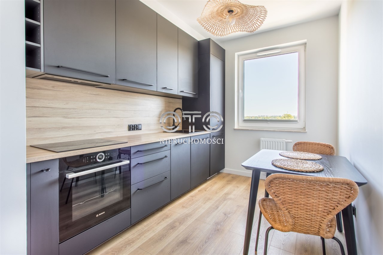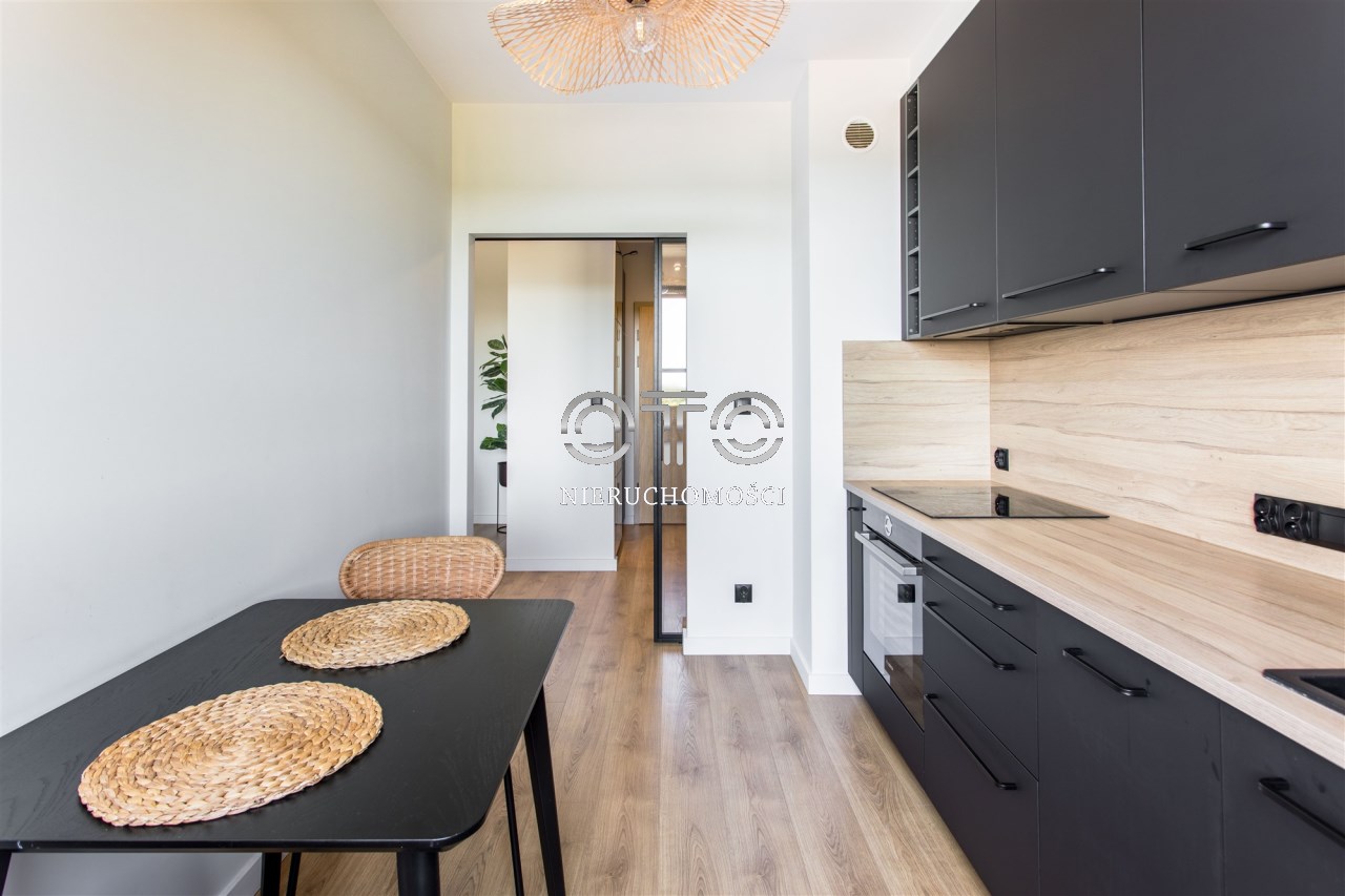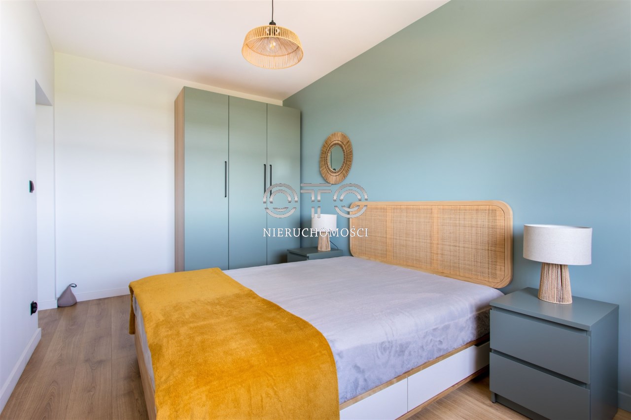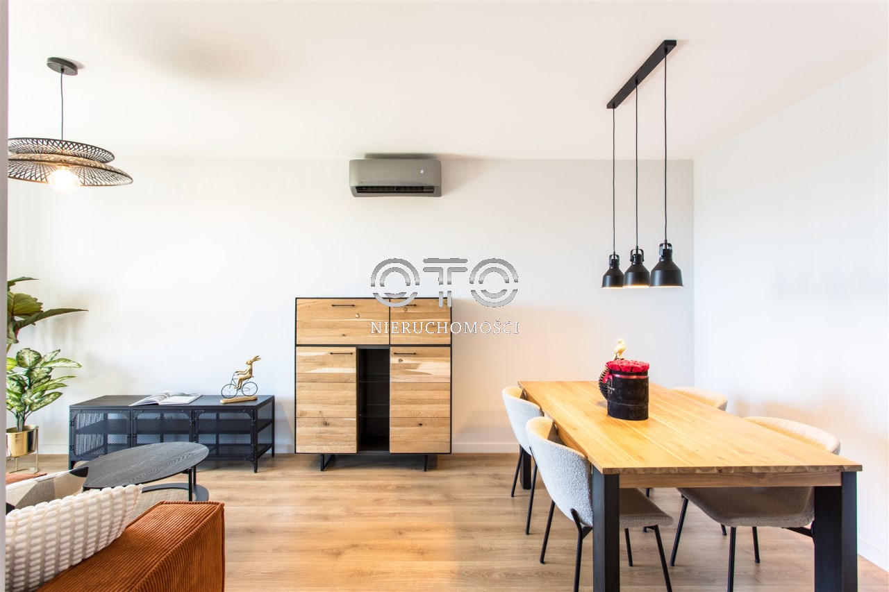 W salonie rozkładana sofa, wygodny stół. Kuchnia jest komfortowo zaprojektowana na wymiar z pełnym AGD (zmywarka, piekarnik, płyta indukcyjna, duża lodówka). W sypialni duże łóżko z materacem oraz duża szafa, a także biurko do pracy zdalnej.