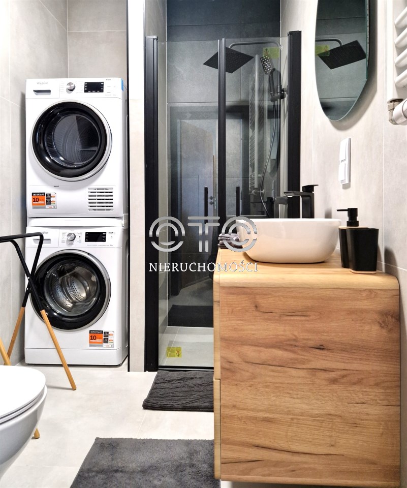 W łazience wygodna kabina z prysznicem, oddzielnie pralka oraz suszarka.