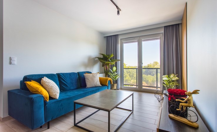W salonie rozkładana sofa, wygodny stół oraz duża szafa na wymiar. Kuchnia jest komfortowo zaprojektowana na wymiar z pełnym AGD (zmywarka, piekarnik, płyta indukcyjna, duża lodówka). W sypialni duże łóżko z materacem oraz duża szafa.